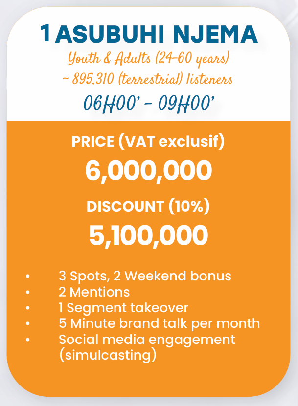 Kipindi cha Asubuhi Njema kinatoa fursa nzuri kwa taasisi mbalimbali kutangaza bidhaa au huduma zao kupitia sehemu zake mbalimbali. Matangazo yanaweza kufanyika kwa namna ya kipekee (exclusive) au kushirikishwa na wadhamini wengine (inclusive). Kipindi hiki pia hupokea matangazo kupitia mitandao ya kijamii kabla, wakati, na baada ya kipindi kuruka hewani, hivyo kutoa fursa pana ya matangazo na kufikia wasikilizaji wengi zaidi.
