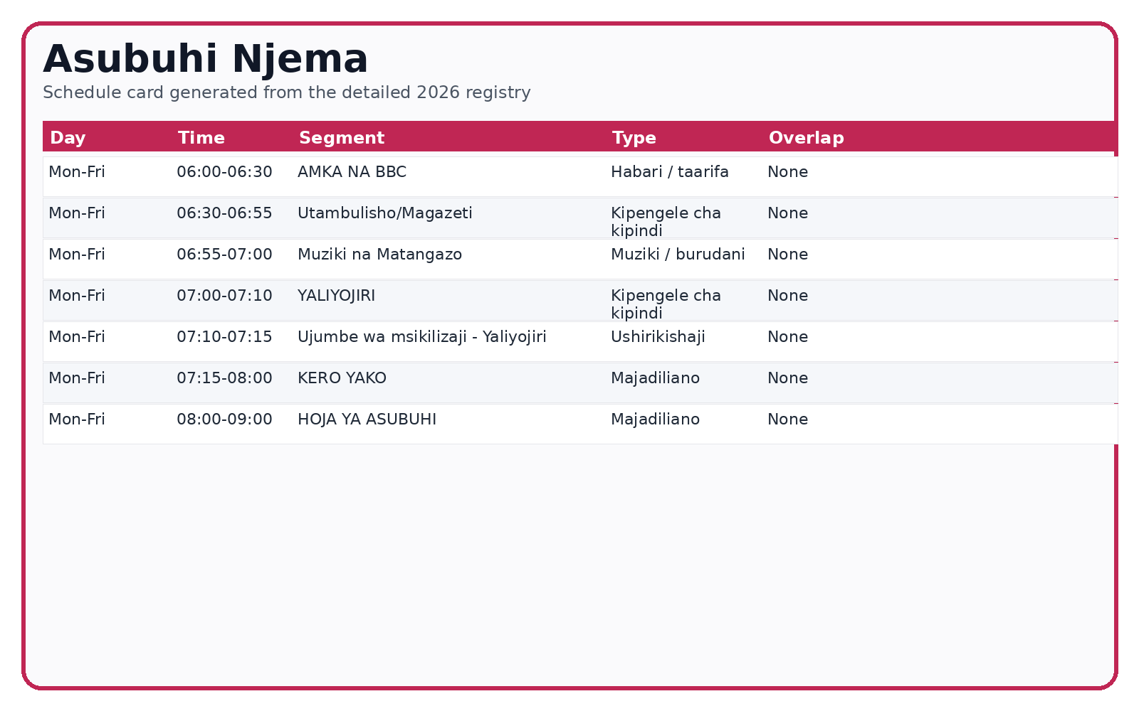 | AMKA NA BBC | Jumatatu-Ijumaa | 06:00 | 06:30 | Habari / taarifa | Amka na BBC ni dirisha la dakika 30 la habari na uchambuzi wa kimataifa kutoka BBC linalofungua ratiba ya asubuhi. Husaidia wasikilizaji kupata mtazamo mpana wa dunia mapema kabla ya kuingia katika ajenda za ndani. |